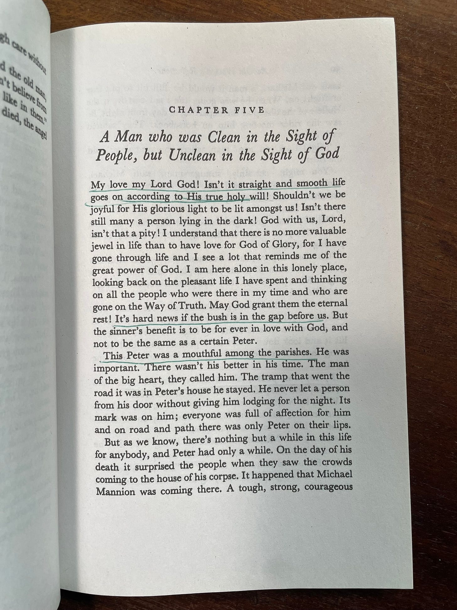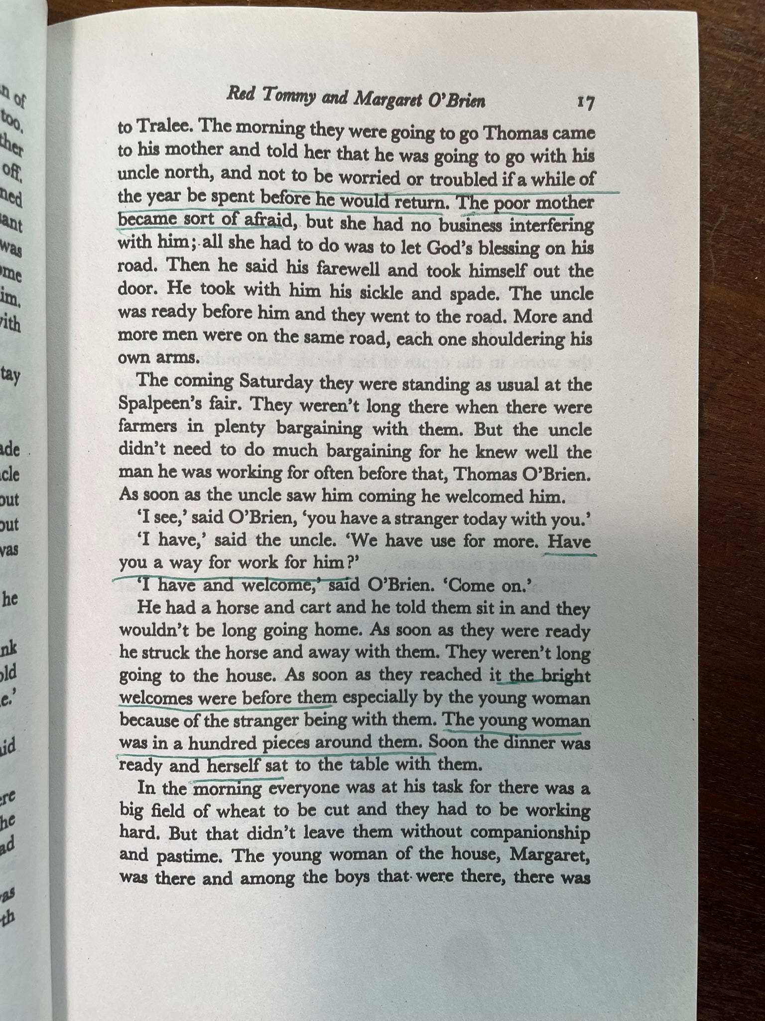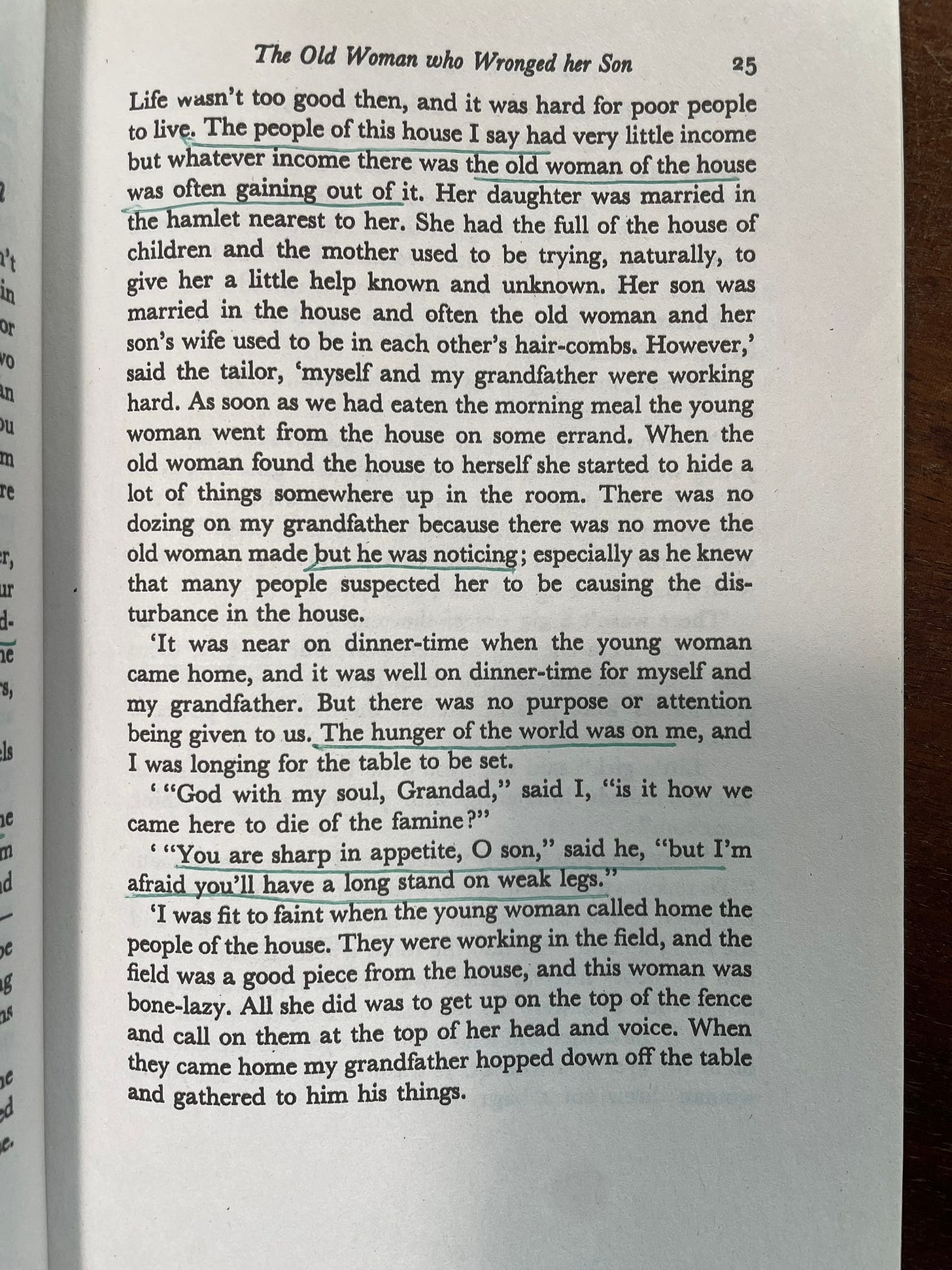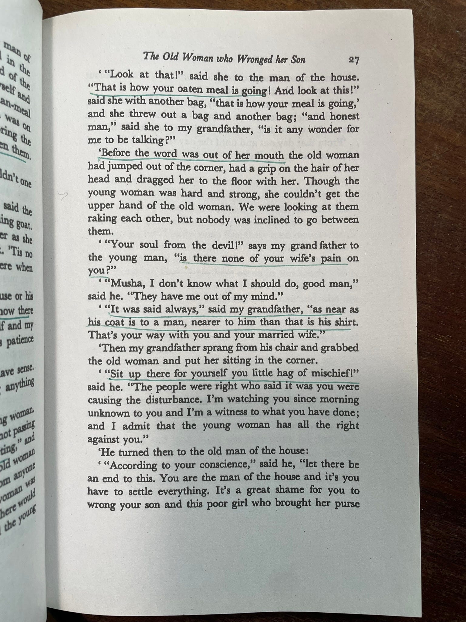 The real surprise, though, was the translation. By Séamus Ennis, a musician and collector of Irish folk-songs, it took me into a foreign poetry that I could never have entered otherwise. Though I’ve visited here and there over the years, I haven’t spent much time in Ireland—nor, alas, have I spent much time reading the Irish writers. This Irish English was so fascinating and rhythmic and beautiful that I could, or at least I thought I could, hear Peig’s original Irish language behind it. I’ll post a few pages with some of the expressions I underlined.